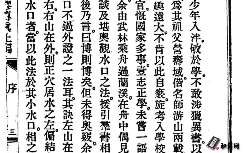 公中君少年入泮。敏于学。不敢涉猎异书。以纷其志。光绪丁西。为其祖父营寿域。偕名师游山两载。尽得秘传。然君志趣远大。不肯以此自亵。旋考入学校。毕业后历充中级官。慨国家多事。壹志正学。未尝一语涉及堪舆。丁未岁。余由武林乘舟过兰溪。在舟中偶见一佳水口。与友人谈及堪舆观水口之法。援引群书相证。君不赞一语。最后乃言。曰博则博矣。但未得奥窍。