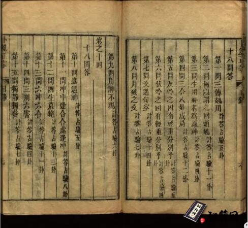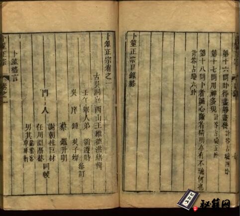 《卜筮正宗》,清人王洪绪辑撰,宏道堂梓行,十四卷,十四册一函全。半页九行,每行二十字。书页宽大,左右双边,版心单鱼尾。