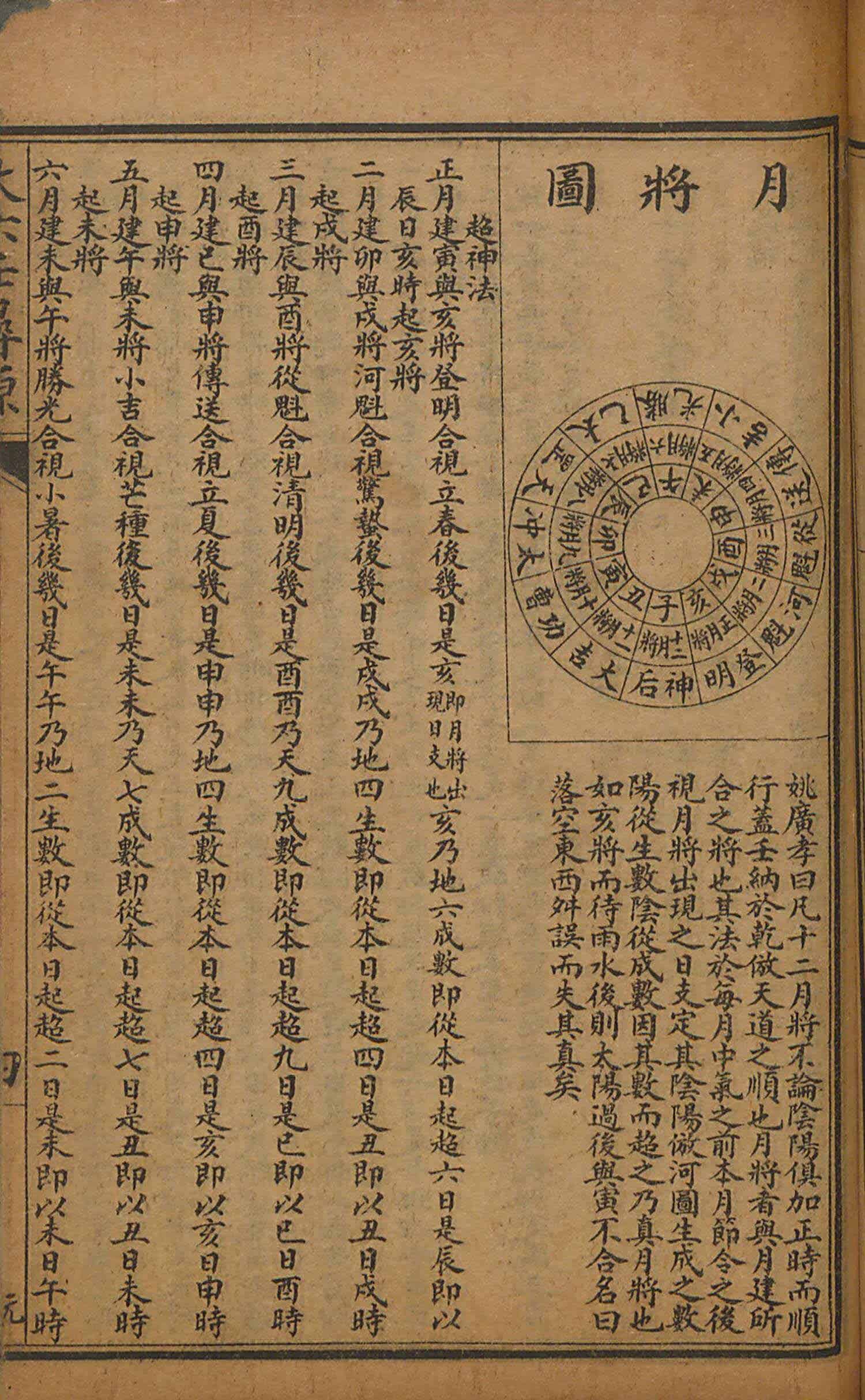 月将诸书皆无定法,有以惊蛰前几日用亥将者,有以雨水后用亥将者,有以时宪书太阳过宫而易将者,不无有误,今以姚少师超神法為定,其法放河图生成之数,阳从生数,阴从成数,因其数而超之,此為真月将,其论最有理,今宗之。