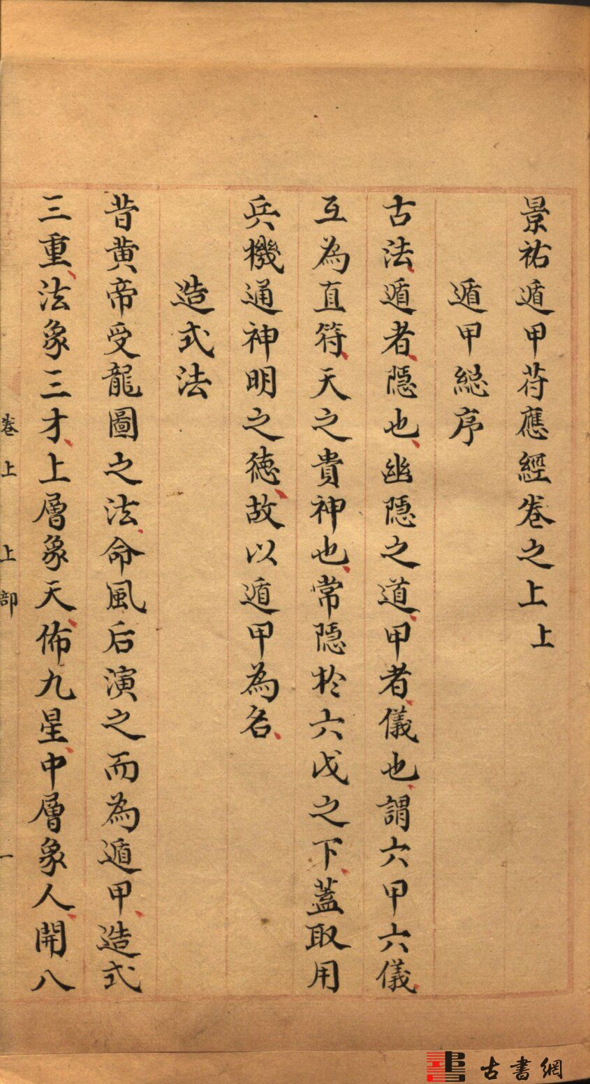 此《景祐遁甲符应经》旧题宋杨维德等撰,景祐是宋仁宗赵祯的年号。全书共分上下部,各三卷,其主要内容以奇门遁甲论行军趋避之用、百事凶吉,书内正文正楷墨书,图符朱书。此本现藏于美国国会图书馆,应为明末朱丝栏钞本,卷前有宋仁宗御制序,卷后有王巽序。