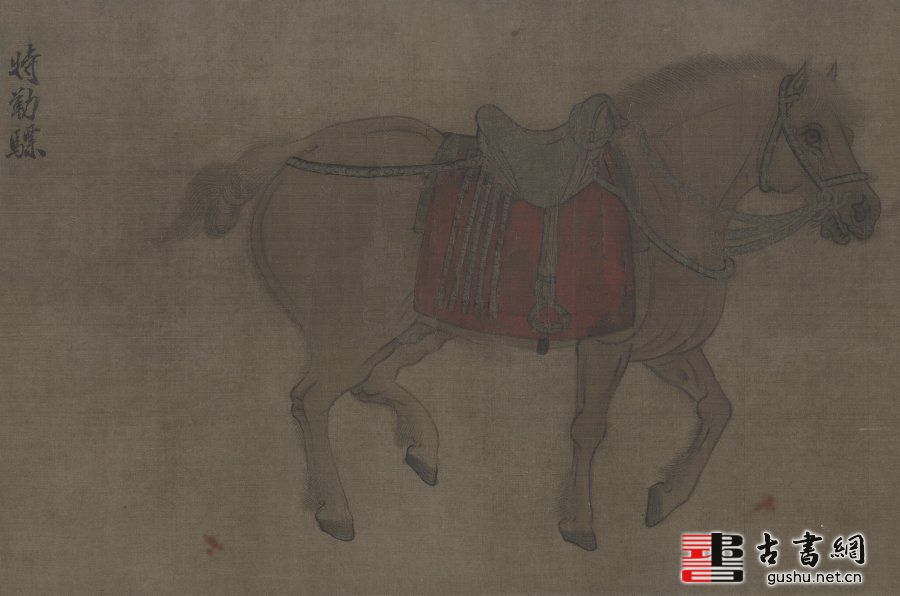昭陵六骏是指陕西醴泉唐太宗李世民陵墓昭陵北面祭坛东西两侧的六块骏马青石浮雕石刻。每块石刻宽约 205 厘米、高 170 厘米,厚 30 厘米、重约 2.5 吨。“昭陵六骏” 造型优美,雕刻线条流畅,刀工精细、圆润,是珍贵的古代石刻艺术珍品。六骏是李世民在唐朝建立前先后骑过的战马,分别名为拳毛騧、什伐赤、白蹄乌、特勒骠、青骓、飒露紫。为纪念这六匹战马,李世民令工艺家阎立德和画家阎立本(阎立德之弟),用浮雕描绘六匹战马列置于陵前。唐昭陵六骏浮雕在宋初被勒石摹刻,此画与石刻拓片的线条结构几乎一致,赵霖很可能参酌了北宋的石刻拓片而作。从画风看,此图明显吸收了汉族艺术传统,继承唐和北宋时代的画马技法,尤多唐代韩幹遗韵。造型准确朴拙,线描柔和匀细,设色浓重沉厚,渲染富有质感。(介绍参考)