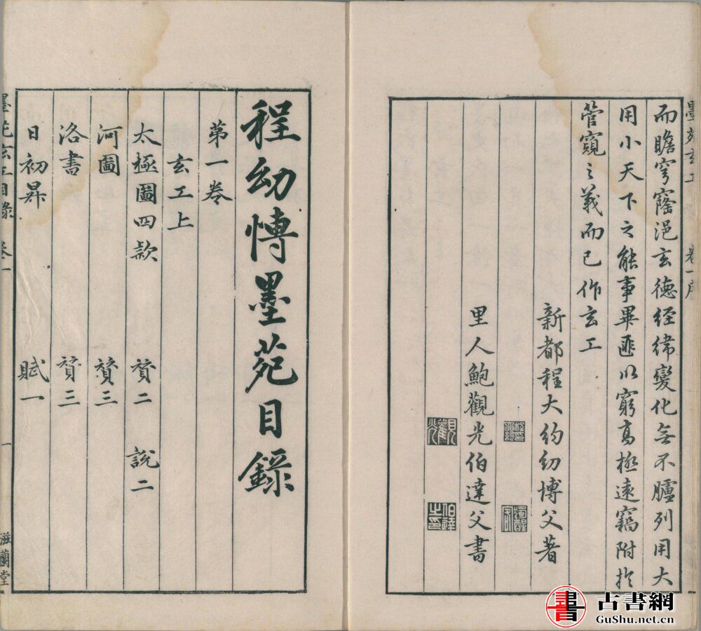《程氏墨苑》是明万历年间制墨大师程大约编,著名画家丁云鹏绘图,徽刻名工黄轔、黄应泰、黄应道镌刻的墨谱。全书分:玄工、舆图、人官、物华、儒藏、缁黄六类。为了造势,程大约还请了当时诸多名流作序编为人文爵里。此内含明万历时期滋兰堂刊彩色套印本及墨印后定本。