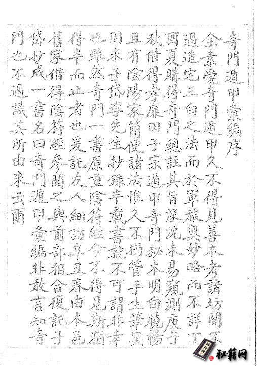 余素这奇门遁甲久不得见善本,考诸坊间不过造宅三白之法,而于军旅奥妙略而不详丁酉夏得奇门总注,基上深沈未易窥测庚子。秋借得孝廉田子,宗遁甲奇门秘本,明白晓畅且有阴阳家简便诸法,惟久不搦管手生笔突,因求子岱李先生抄录半载书就不可谓非幸也,虽然奇门一书原重阴阳符经,今不得见斯酋得丰而止者也,