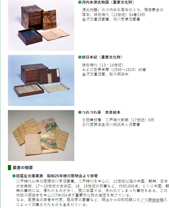 1950年从德川灵明会转移的旧保座文库收藏 江户时代以来尾张德川家的旧藏品。以江户时代为主的约 65,000 件藏品,包括中国、韩国和日本的 12 世纪以后的经典书籍,17 至 19 世纪的古画,以及 18 和 19 世纪的兰书。尤其是中国和韩国的很多书都很优秀,有些书在本国已经失传了。以这本内骏河转让书为中心,有7件154件被指定为重要文化财产。它还包括从明治时代到昭和初期通过捐赠和购买收集的书籍,例如尾张氏族学者中村和尾崎的收藏。”