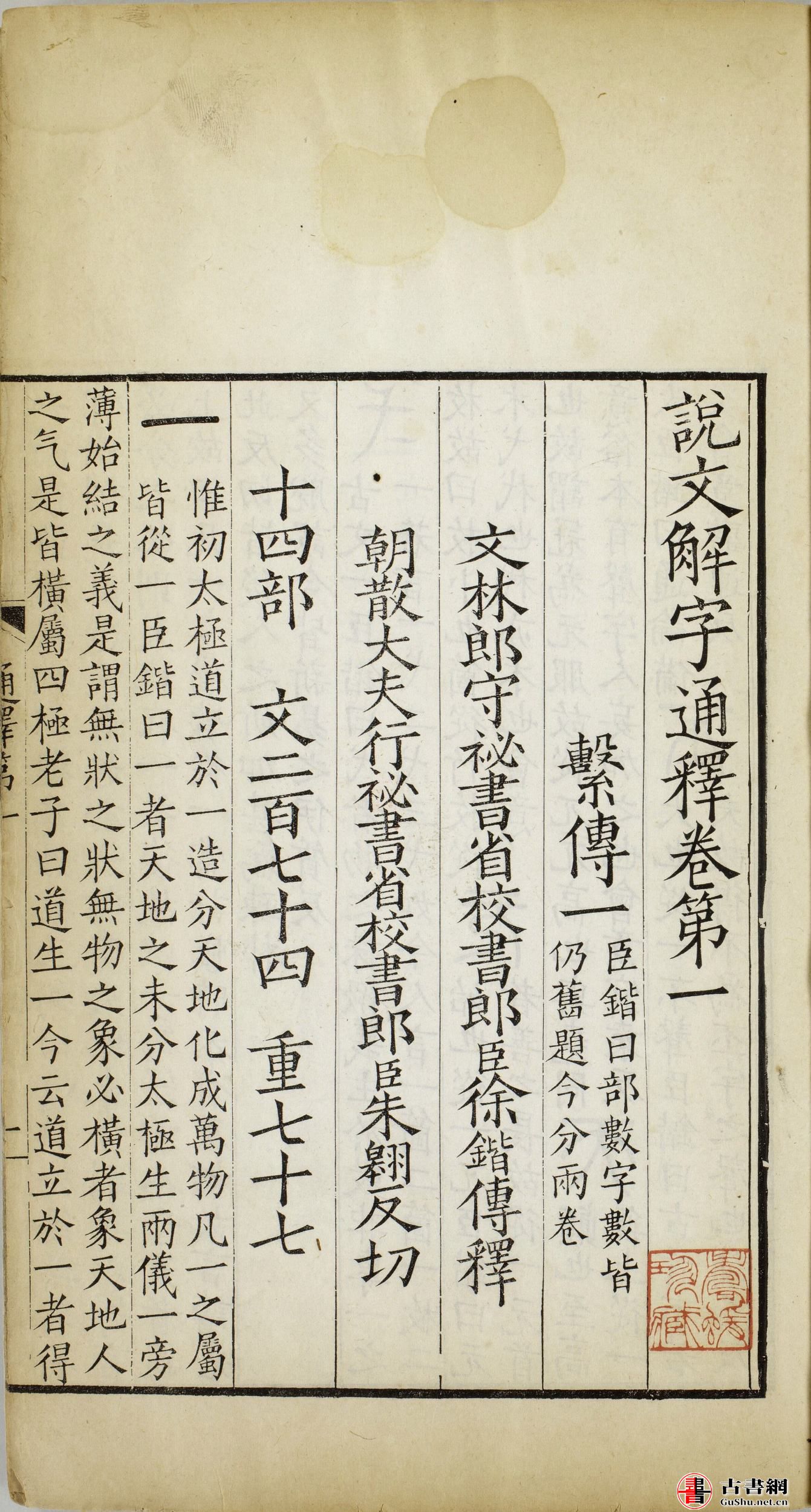 卷首题:文林郎守秘書省校書郎臣徐鍇傳釋、朝散大夫行秘書省校書郎臣朱翶反切