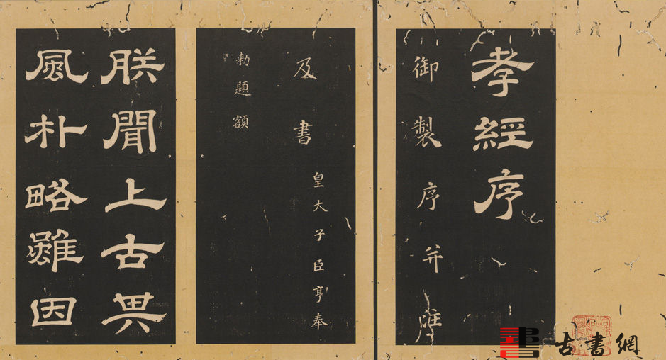 此碑刻于唐玄宗天宝四年(公元 745),是唐玄宗李隆基亲自作序、注解并书写。李亨篆额。书法工整,字迹清新,秀美多姿。此碑由四块黑色细石合成,方额、盖石、顶上等均做了非常艺术化的处理,碑下有三层石台阶,故称《石台孝经》。此本为清末的一个拓本。
