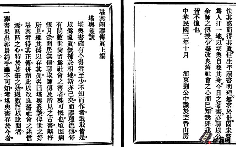 今年春过杭。得君函亟乘轮访之。君闻余至。来客舍握手畅谈。以叙阔别。余缕述各处堪舆谬妄之情形。君感慨良久。曰。此由上世堪舆俗书遍布人间。谬种流传之所致。若不抉俗书根本上之谬妄。盲从者众牢不可破。虽日以科学晓之。终无以拔其。果灼知堪舆之正法。信其可信。不因妄而迷。则堪舆实无一事有害于社会也。别后。君即本其心得。著一书。辟尽古今堪舆之谬说。改良旧社会。并揭古今名师之真谛。以启迪今之为堪舆者。书成。名曰堪舆辟谬传真。不著郡邑真名。但隐约其名。署曰公中。
