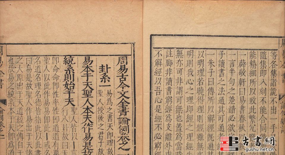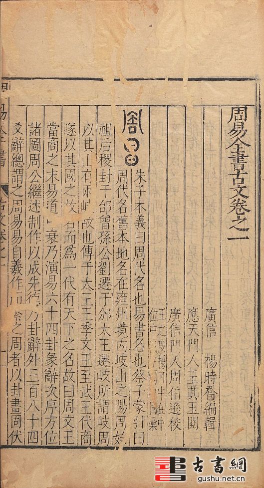 此《周易古今文全书》共二十一卷,明代理学家杨时乔撰。全书分为六部:《论例》二卷,《古文》二卷,《今文》九卷,《易学启蒙》五卷,《传易考》二卷,附《龟卜考》一卷,每部前有自序。易学启蒙和传易考部分配有大量插图。此为明万历时期王其玉刊本。