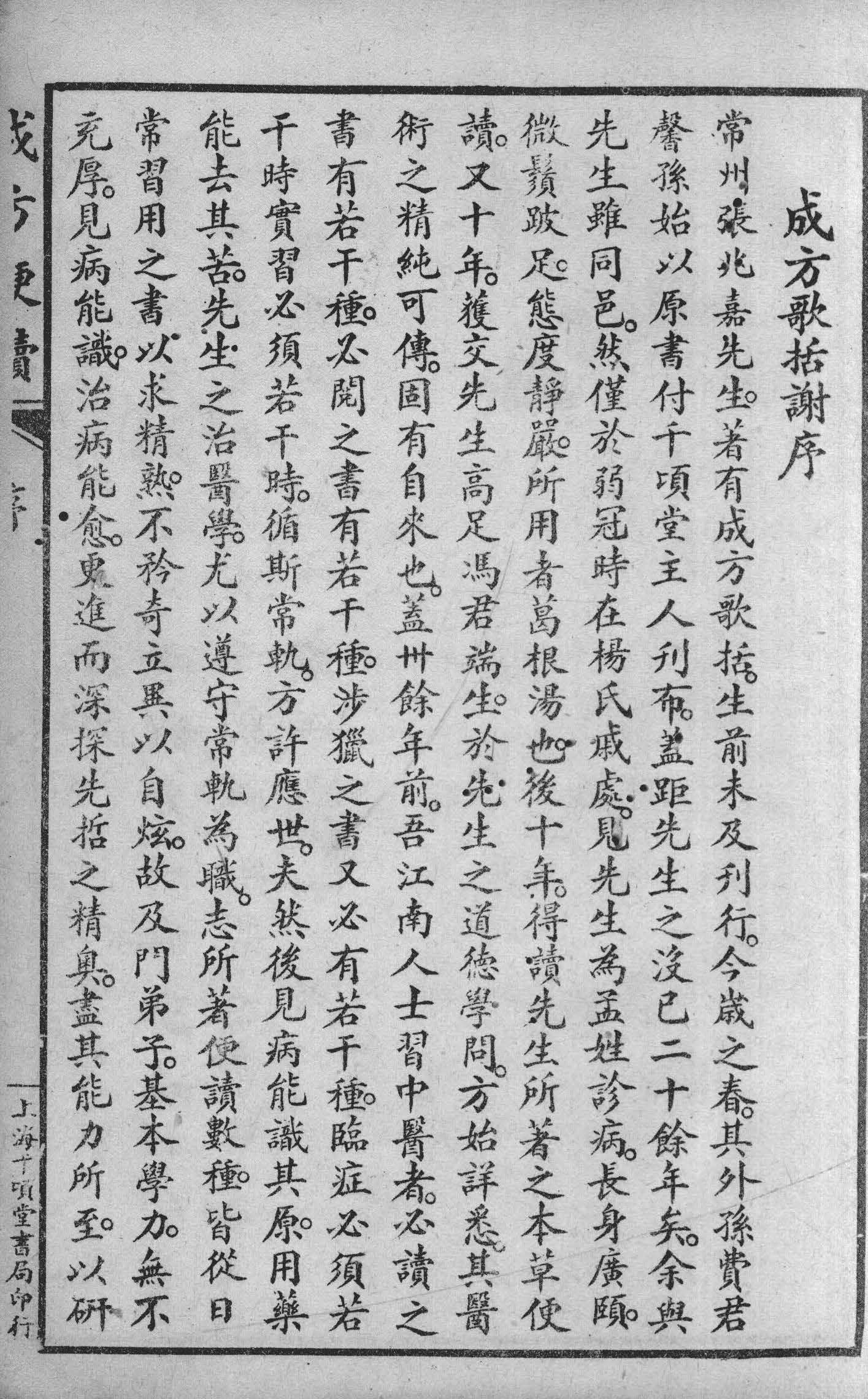 常州张兆嘉先生,著有成方歌括,生前未及刊行,今岁之春,其外孙费君馨孙始以原书付千顷堂主人刊布,盖距先生之没已二十餘年矣,余与先生虽同邑,然仅於弱冠时在杨氏戚处,见先生為孟姓诊病,长身广颐,微鬚跛足,态度静严,所用者葛根汤也,后十年,得读先生所著之本草便读,又十年,获交先生高足冯君端生,於先生之道德学问,方始详悉,其医术之精纯可传,固有自来也,盖卅餘年前,吾江南人士习中医者,必读之书有若干种,必阅之书有若干种,涉猎之书又必有若干种,临症必须若干时实习必须若干时,循斯常轨,方许应世,夫然后见病能识其原,用药能去其苦,先生之治医学,尤以遵守常轨為职,志所著便读数种,皆从曰常习用之书,以求精熟,不矜奇立异以自炫,故及门弟子,基本学力,无不充厚,见病能识,治病能愈,便进而深探先哲之精奥,尽其能力所至,以研究扩充之,此冯君之所以驰名於白下也。